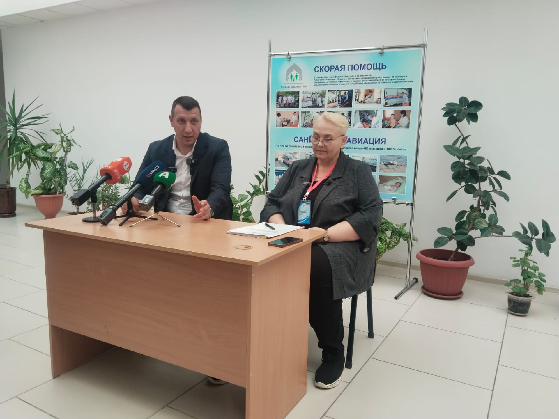 Фото: и. о. главного врача КГП "Костанайская областная станция скорой неотложной медицинской помощи" Олег Мелешенко и председатель КОФ "Отраслевой профсоюз работников системы здравоохранения Senim" Татьяна Булгацевич.