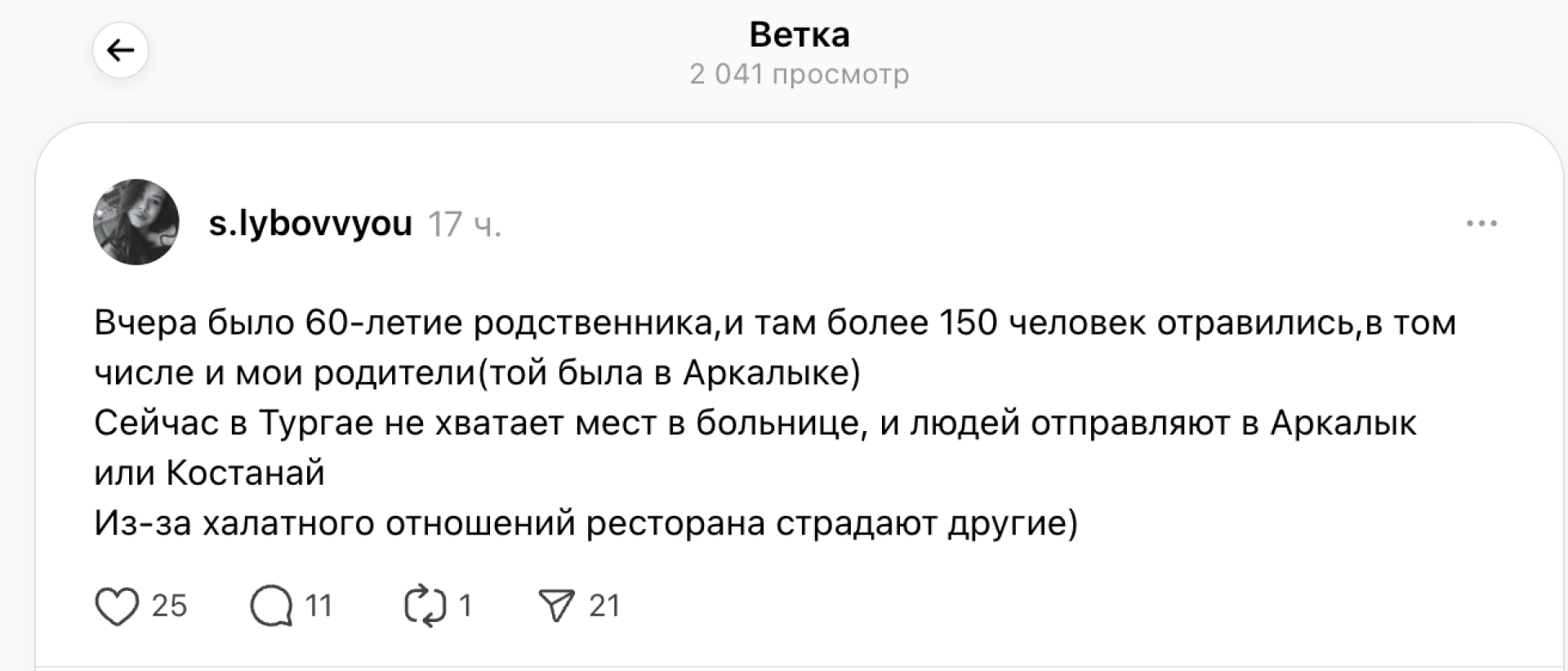Сообщается, что на юбилее, проходившем в Аркалыке, более 150 человек, включая родителей автора поста, начали испытывать симптомы отравления. На данный момент официальные данные от местных властей или санитарных служб не поступали, и обстоятельства инцидента продолжают уточняться.