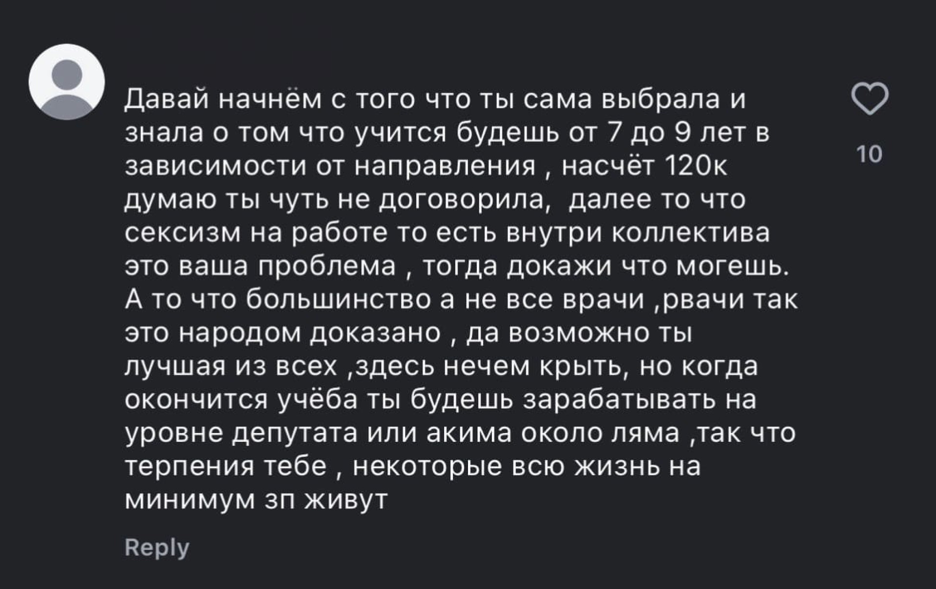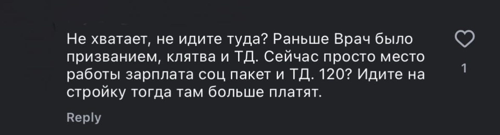 Обсуждение в интернете свелось к деньгам: «Много ты хочешь, дорогуша, сначала покажи и докажи». Ботагоз задается вопросом, почему ей нужно что-то доказывать. Она говорит о низких зарплатах резидентов и молодых врачей, но это не единственная проблема.