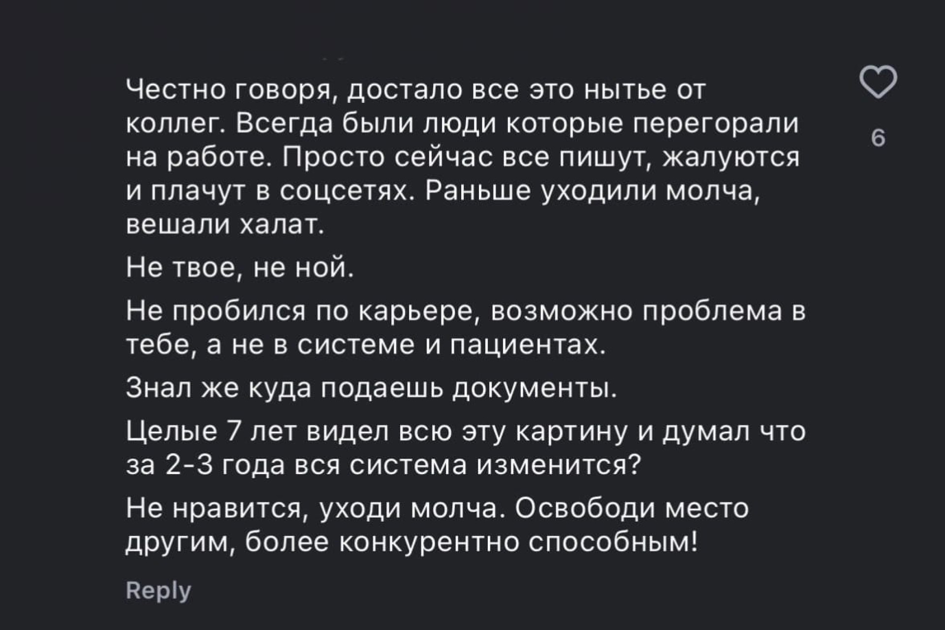 Ботагоз отмечает, что многие врачи, даже те, кто сам прошел через трудности, не понимают сути проблемы. Она говорит о том, что профессиональное выгорание стало нормой, и это не должно быть так.