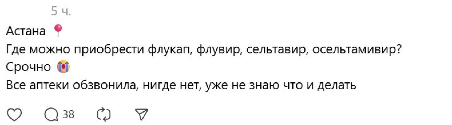 В последние дни в Казахстане наблюдается рост жалоб на дефицит противовирусных препаратов в аптеках, особенно в столице. Граждане сообщают о трудностях в поиске медикаментов, необходимых для лечения гриппа и других вирусных заболеваний, таких как флукап, флувир и тамифлю. Наиболее активные обращения поступают от жителей Астаны, где, по их словам, данные лекарства практически отсутствуют.