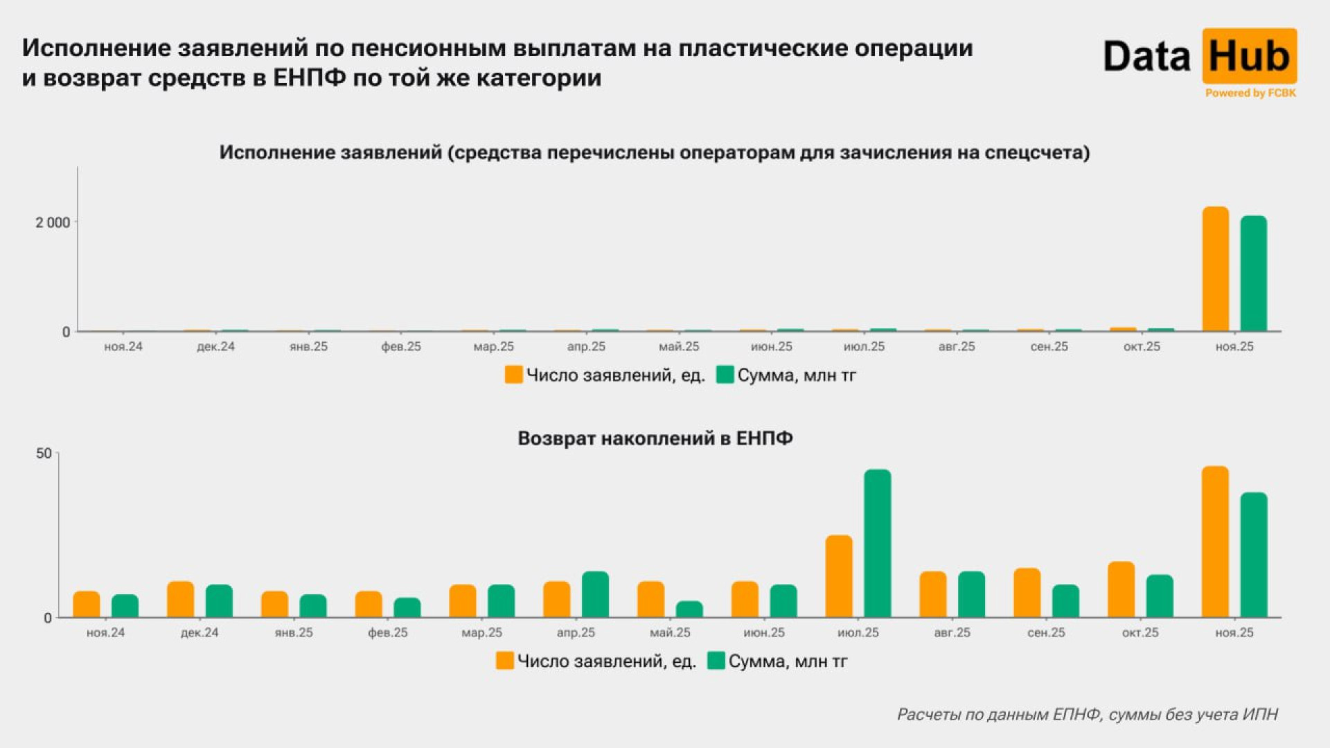 По данным аналитического канала Data Hub, в Казахстане наблюдается резкий рост пенсионных изъятий на лечение, особенно в области пластической хирургии. В ноябре 2025 года было исполнено 2 277 заявлений на единовременные пенсионные выплаты для оплаты реконструктивных и восстановительных операций, что составило около 2,1 миллиарда тенге.