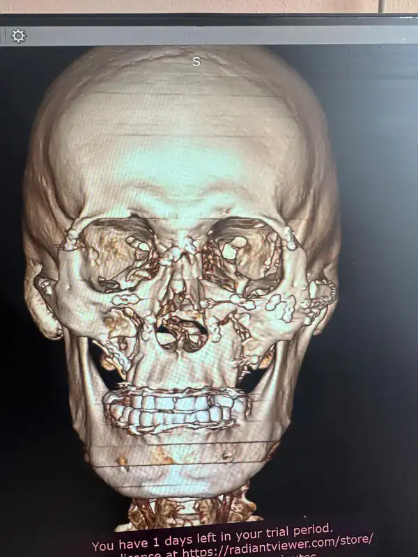 Во время обследования врачи выявили множественные переломы костей лицевого черепа, включая двусторонние переломы скуло-орбитального комплекса, а также повреждения перегородки носа и стенок орбит. Компьютерная томография подтвердила наличие смещённых костных фрагментов, что требовало немедленного вмешательства.