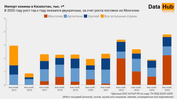 Предварительные данные показывают, что в 2025 году забой скота в Казахстане достиг 177,9 тысячи тонн, увеличившись на 4% по сравнению с 2024 годом. Увеличение импорта на фоне роста внутреннего производства может свидетельствовать о расширении потребления конины в стране.