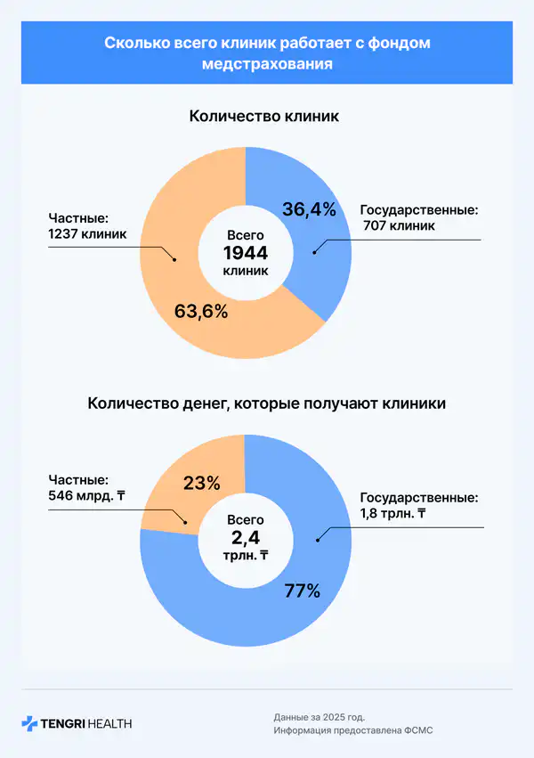На данный момент в первичном звене медицинской помощи практически равное количество государственных и частных клиник: 358 и 340 соответственно. Однако, если проанализировать распределение финансирования, государственные поликлиники получают почти в три раза больше средств из фонда медстрахования, чем частные. Это связано с тем, что государственные клиники, как правило, больше и обслуживают большее количество пациентов.