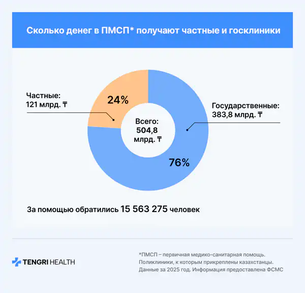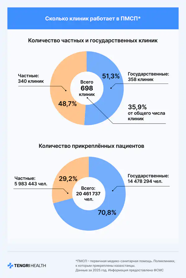 С каждым годом количество частных клиник, работающих в ПМСП, увеличивается: в 2020 году их было 215, сейчас — 340. При этом число пациентов, желающих прикрепиться к частным клиникам, возросло с трёх до почти шести миллионов.