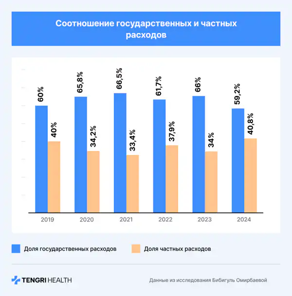 Согласно отчету Бибигуль Омирбаевой, в 2024 году казахстанцы потратили почти 1 триллион тенге на лекарства, что составляет 59% от общих карманных расходов на здравоохранение. Ещё 522 миллиарда тенге было потрачено на амбулаторное лечение, включая приёмы врачей и анализы, и почти 134 миллиарда тенге — на стационарные услуги, то есть на операции.