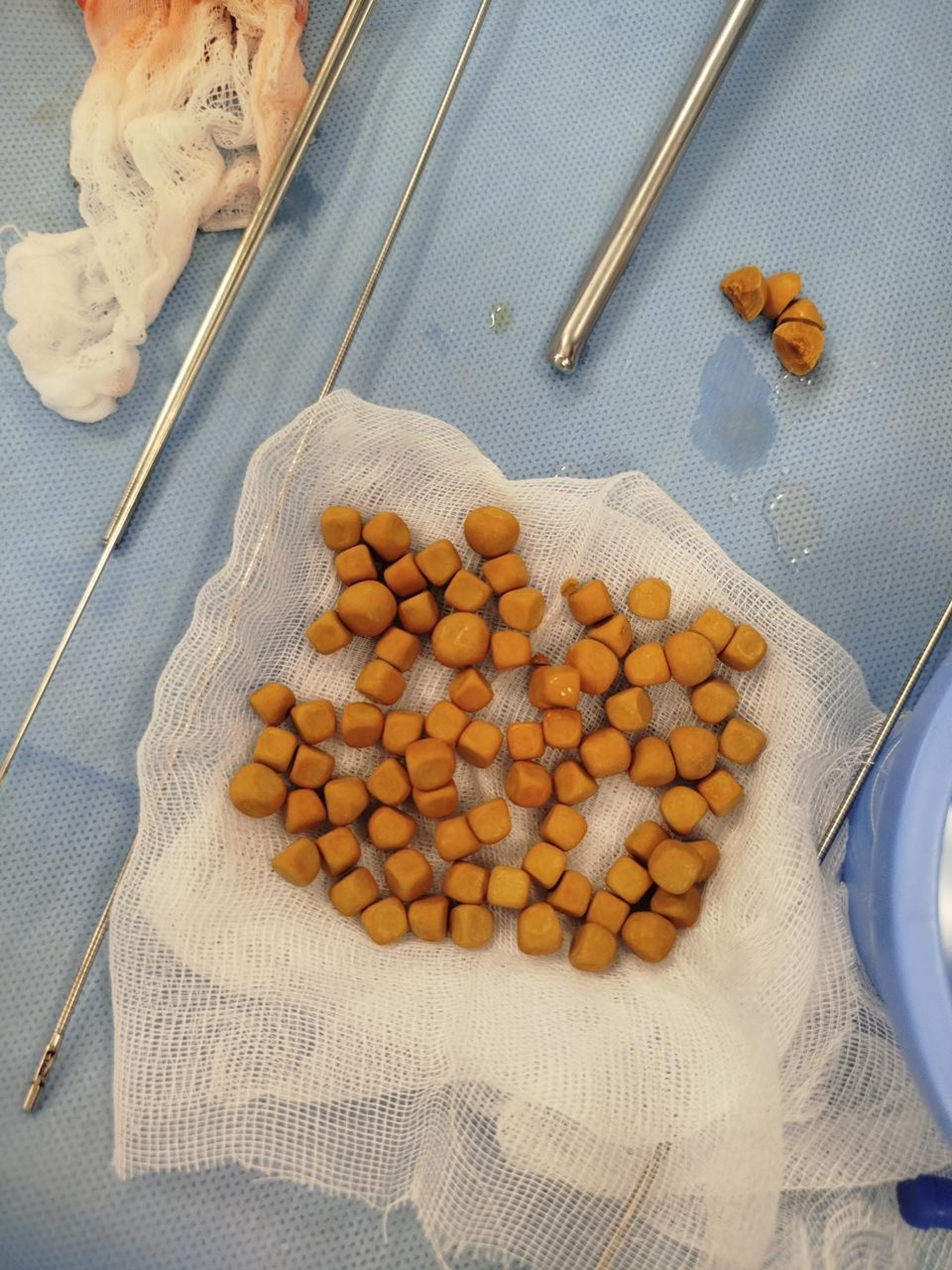 В результате хирургического вмешательства было успешно извлечено 80 камней. После операции пациент перенес период восстановления без осложнений. Урологический катетер был снят на третьи сутки, а на пятый день его выписали домой в связи с улучшением состояния.