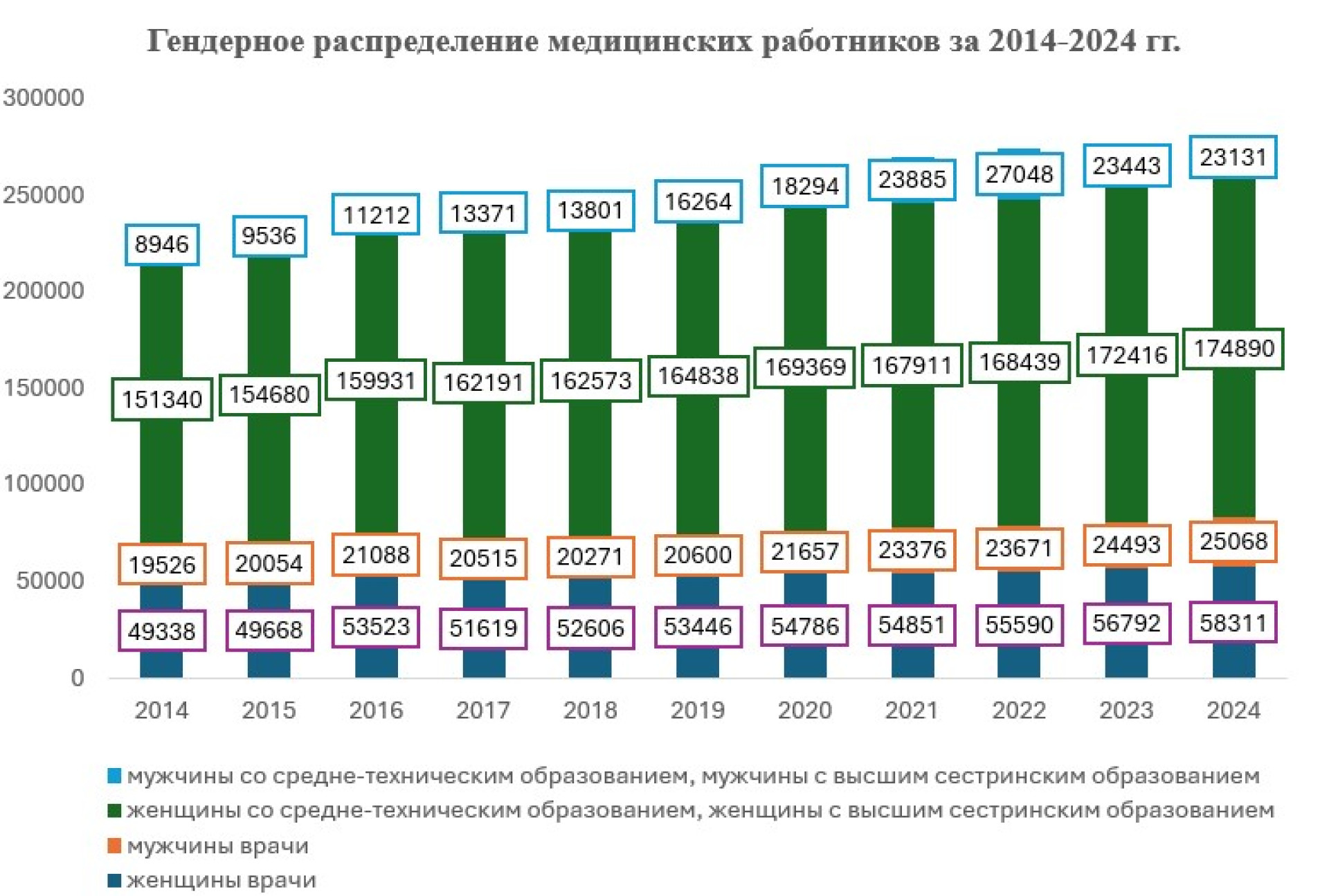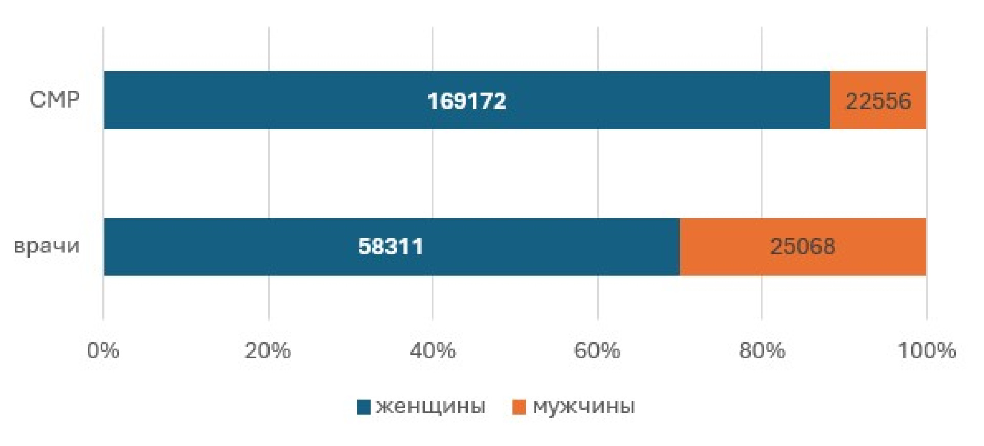 Средний медицинский персонал, включая медсестер, акушерок и фельдшеров, также в значительной степени представлен женщинами — их доля составляет более 88%, или 174 890 человек.